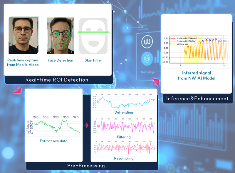 딥러닝을 통해 학습한 AI모델에서 비디오 영상 데이터를 이용하여 광혈류측정법으로 구할 수 있는 생체 데이터를 추론합니다. 특별한 광학 센서가 필요 없이 현대의 대부분의 모바일 기기에 탑재되는 카메라로 동작하는 것이 장점입니다.